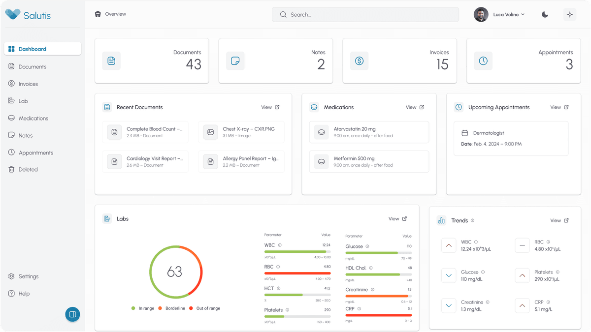 Salutis integrates artificial intelligence to transform complex medical documents into structured, actionable health insights. The AI system automatically extracts and categorizes laboratory results, medical reports, and health data from uploaded documents, eliminating manual data entry while maintaining accuracy. Advanced algorithms analyze health trends over time, providing personalized insights and anomaly detection to help users understand their health patterns.